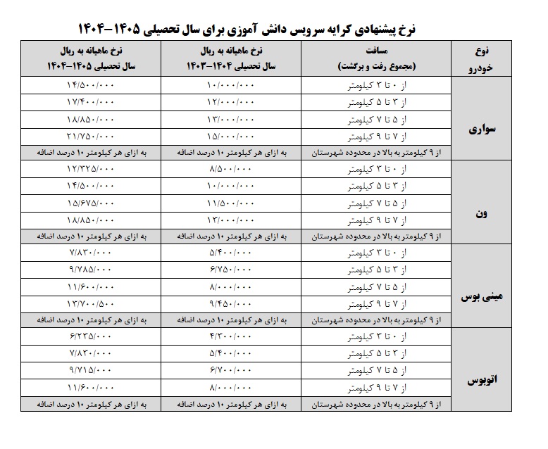 با استناد به مجوز شورای اسلامی شهر اندیشه نرخ کرایه سرویس های حمل و نقل دانش آموزی شهر اندیشه در سال 1404-1405به شرح جدول ذیل می باشد.